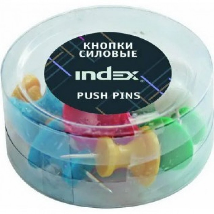 Кнопки силовые Index цветные. Длина 26 мм . Применяются для крепления листов к офисным пробковым доскам, другим поверхностям и для маркировки. В упаковке 10 штук в пластиковой баночке.