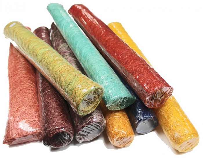 Сизаль -натурально волокно, может быть окрашено. Активно используют во флористике, для создания вещей в стиле хэнд-мейд и детского творчества.