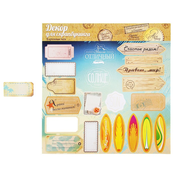 Среди скрап-мастериц картонные вырубные теги имеют множество названий: ярлычки, шильдики, карточки для журналинга – вот только некоторые из них. Но предназначение у них общее – дополнение скрап-работы Вашими впечатлениями и мыслями. Теги имеют поля для текста и яркие надписи на русском языке, с помощью которых можно сделать акцент на самых дорогих воспоминаниях или поздравлениях, сделать их более душевными и придать им законченный, совершенный вид. Теперь каждый памятный случай, приятное воспоминание, путевая заметка, важная дата, праздничное пожелание навсегда останутся в Вашей истории. Для начала работы их просто нужно выдавить из картонной основы по линиям реза, а затем, легко и просто декорировать ими Ваш проект, используя обычный клей или двусторонний скотч.