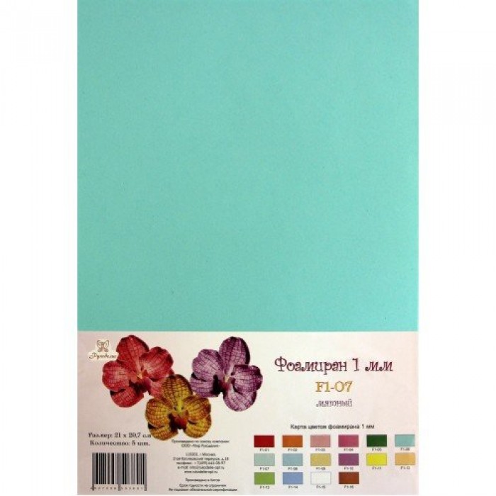 Лист фоамирана (вспененной резины), толщина листа 1 мм, размер 21*29.7 см. Резину можно резать ножницами, ножом, формировать из нее разные украшения, клеить. Вырезанные детали практически не имеют веса, очень легкие. Прекрасно подходит для детского творчества (от 3 лет).