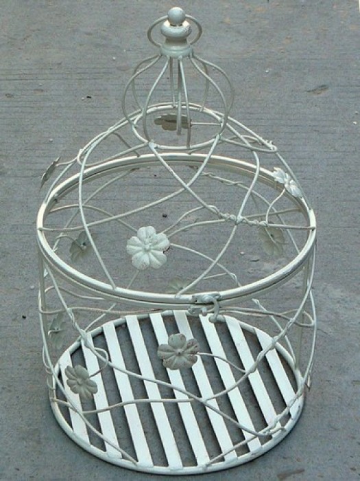Большая клетка круглого сечения, с откидывающейся крышкой. Диаметр дна клетки 30 см, высота 60 см. Выполнена из металлических прутьев, окрашенных белой краской. Прекрасное решение для интерьера, свадебного декора!