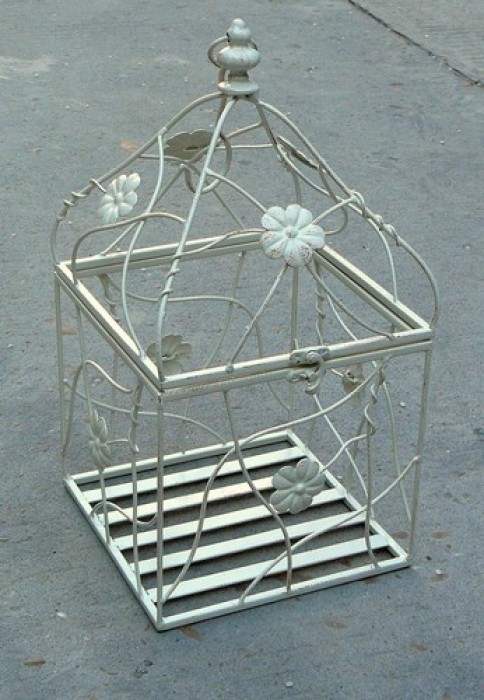 Большая клетка квадратного сечения, с откидывающейся крышкой. Размер дна клетки 25,5*25,5 см, высота 98 см. Выполнена из металлических прутьев, окрашенных белой краской. Прекрасное решение для интерьера, свадебного декора!