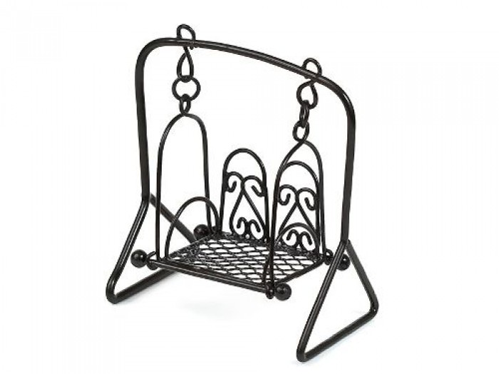 Металлические качели, подвешенные в стойке. Хорошо раскачиваются, устойчиво стоят на горизонтальной ровной поверхности. Размер стойки-опоры 8,5*6,5 см. размер сидячего места в качелях примерно 4*4 см, высота куклы, которая может вместиться на качели (от сиденья) до 8-8,5 см.