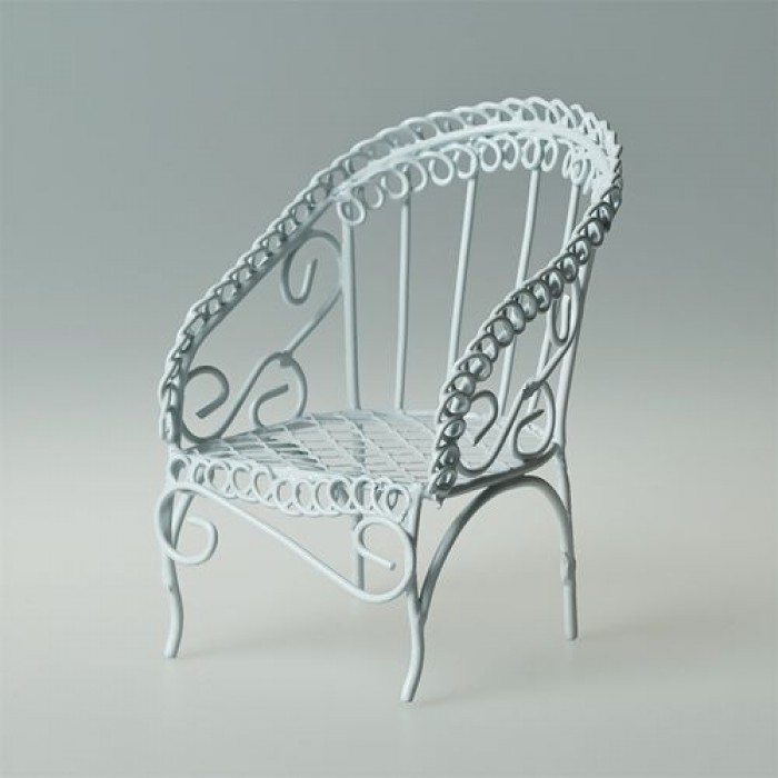 Металлическое миниатюрное кресло с сетчатым сиденьем и полукруглой ажурной спинкой, переходящей в боковые стенки. Размер 5,0*5,0*7,5 см.