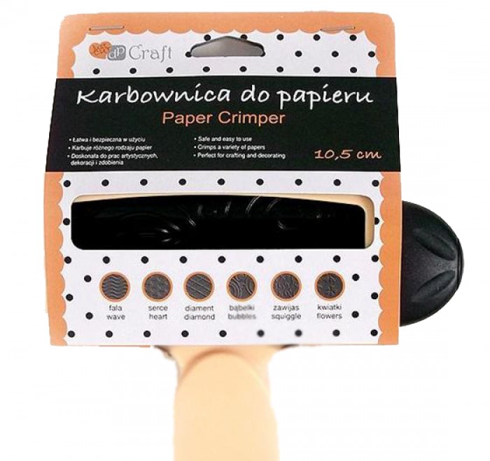 Кримпер — это отличный инструмент для тиснения бумаги. Применяется для создания текстуры на бумаге плотностью 70-220 г/м2 или фольге. Полоска бумаги вставляется между роликами, которые с помощью ручки проворачиваются. Бумажный лист или фольга, проходя через ролики, принимает новый рельефный рисунок. Тисненая бумага ручной работы используется для создания открыток, альбомов, для украшения коробок, рамок для фотографий и т.п.