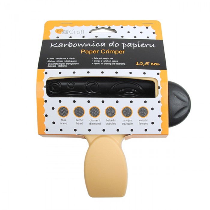 Кримпер — это отличный инструмент для тиснения бумаги. Применяется для создания текстуры на бумаге плотностью 70-220 г/м2 или фольге. Полоска бумаги вставляется между роликами, которые с помощью ручки проворачиваются. Бумажный лист или фольга, проходя через ролики, принимает новый рельефный рисунок. Тисненая бумага ручной работы используется для создания открыток, альбомов, для украшения коробок, рамок для фотографий и т.п.