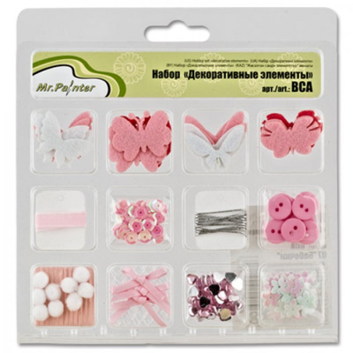 В наборе ассорти из 12 элементов: фетровые, тканевые, пластиковые. акриловые. Все элементы подобраны по цветовой гамме. Декоративные элементы используются для декорирования открыток, альбомов, фоторамочек, подарков.
