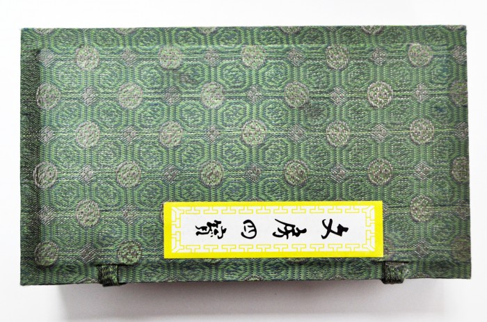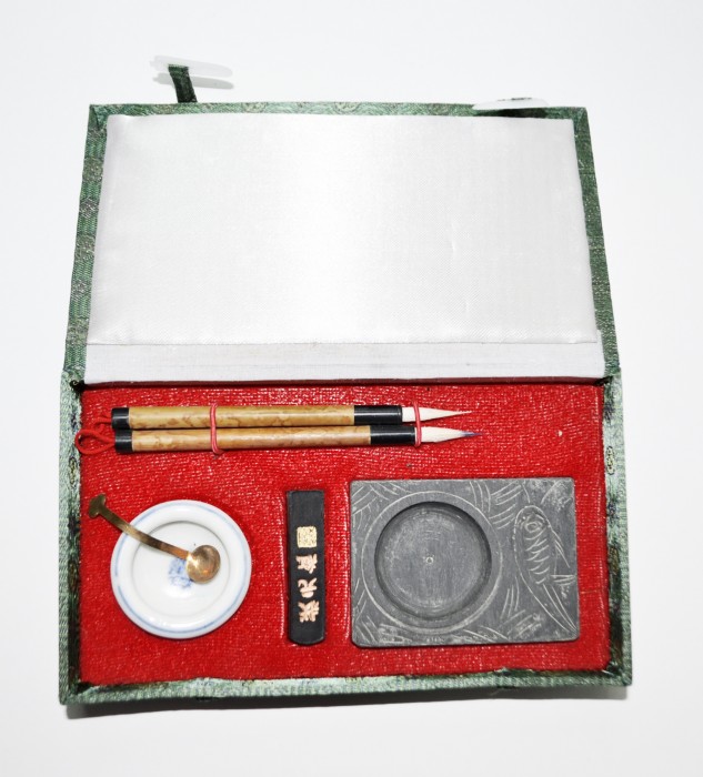 Набор для каллиграфии из 6 предметов в упаковке из картона и шелка: 2 кисти с бамбуковой ручкой, сухая тушь, камень для растирки туши, чернильница, черпачок.