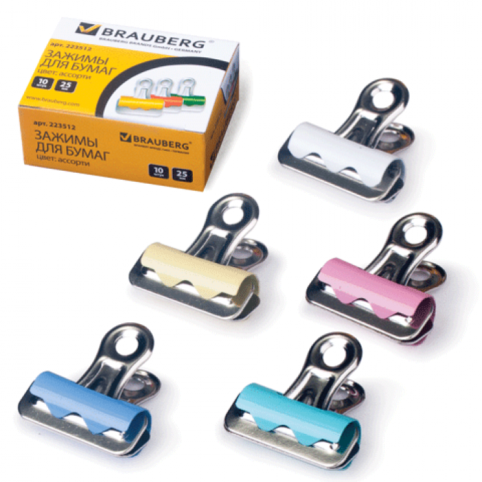 Скрепляют до 100 листов. Размер – 25 мм. Изготовлены из стали. Цветное покрытие, ассорти. 10 штук в картонной коробочке.