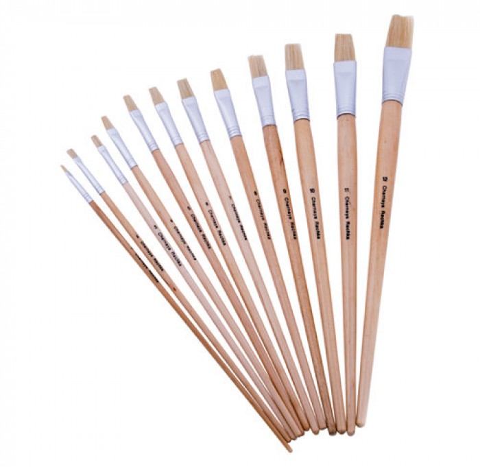 Набор кистей плоских из щетины отбеленной, обойма бесшовная, ручка удлиненная, покрыта лаком.