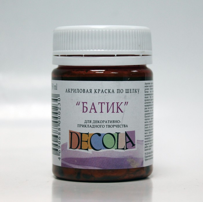 Акриловые краски по шёлку «Батик» серии Decola, в пластиковых банках 40 мл. Предназначены для различных типов натуральных и синтетических тонких тканей. Наносятся непосредственно на ткань кистью. Обладают хорошей растекаемостью. Краски глубоко проникают в волокна ткани, почти не уплотняя её. Закрепляются горячим утюгом с изнаночной стороны. Быстро сохнут.