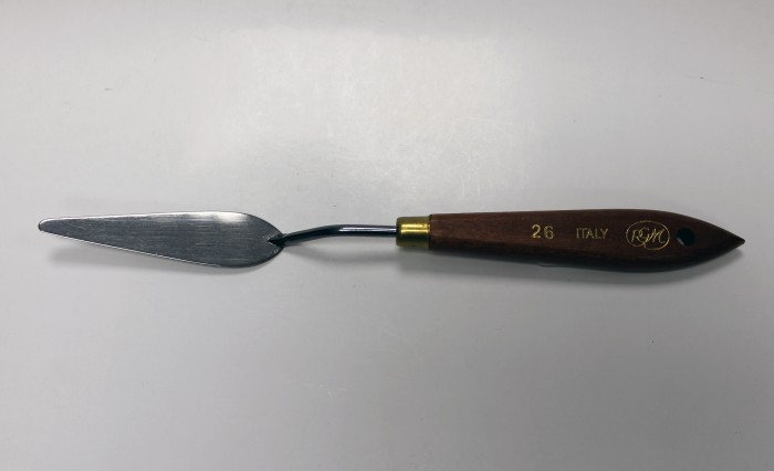 Мастихин произведен в Италии компанией RGM по современным технологиям. Материал - высококачественная каленая сталь обеспечивает необходимую гибкость. Сталь грунтуется и полируется вручную, что обеспечивает высочайшее качество мастихина. Мастихин не хромированный, снабжен деревянной ручкой, покрытой лаком, и медной полированной обоймой.