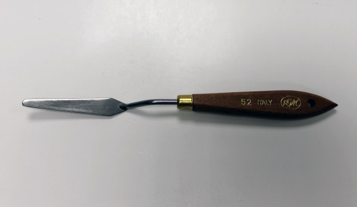 Мастихин произведен в Италии компанией RGM по современным технологиям. Материал - высококачественная каленая сталь обеспечивает необходимую гибкость. Сталь грунтуется и полируется вручную, что обеспечивает высочайшее качество мастихина. Мастихин не хромированный, снабжен деревянной ручкой, покрытой лаком, и медной полированной обоймой.