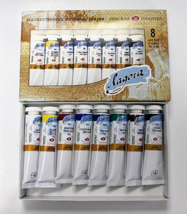 Наборы масляных красок серии «Ладога» в разной комплектации выпускаются Заводом художественных красок «Невская палитра» и традиционно считаются одними из лучших масляных красок отечественного производства. Уже много лет они рекомендуются преподавателями художественных школ, студий и вузов для тех, кто только учится живописному мастерству. В наборе 8 цветов в тубах объемом 18 мл.