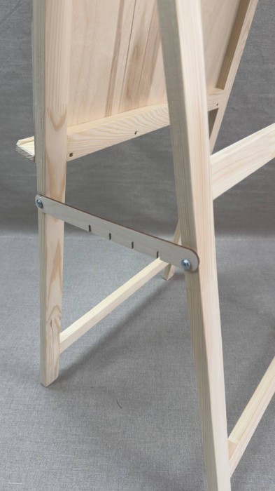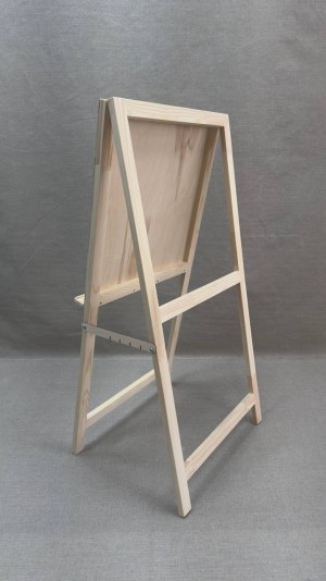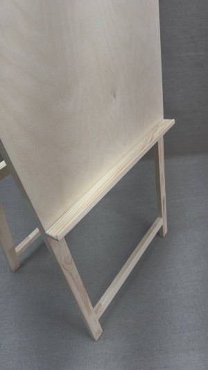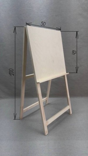 «Мольберт ученический хлопушка» - напольный деревянный мольберт, предназначенный для работ красками и графическими материалами и не требующий планшета. Угол наклона мольберта изменяется при перемещении задних ножек и фиксируется при помощи стопорной планки в четерех положениях. Простая конструкция и удобство использования мольберта делает его незаменимым приобретением для ученика детской изостудии. Лист бумаги или картона может быть зафиксирован на рабочей поверхности - щите мольберта при помощи кнопок. Высота 100 см.