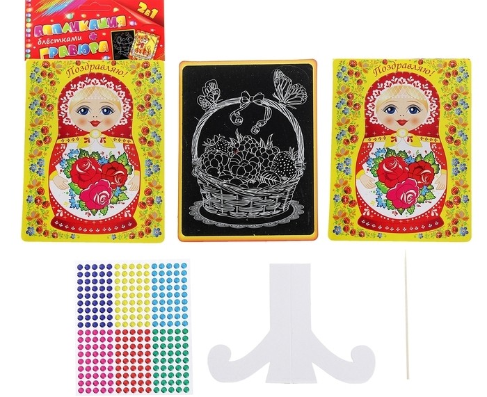 Двухсторонняя аппликация блёстками + гравюра 2 в 1 "Поздравляю" – уникальный в своем роде продукт. На лицевой стороне располагается красочная картинка с веселыми сюжетами. Необходимо украсить ее голографическими клеевыми стразами. На обратной стороне находится гравюра с цветным основанием. Сцарапайте верхний слой, и вы увидите яркий рисунок под ним.