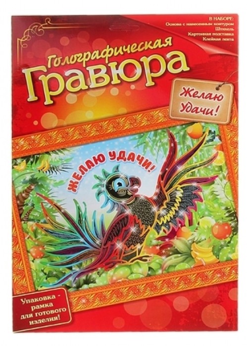 Гравюра цветная "Желаю удачи" , в комплекте штихель, подставка под гравюру – это цветная переливающаяся основа, покрытая местами черной краской, на которое нанесен контур рисунка. С помощью особого скребка (штихеля), который входит в набор, путем процарапывания и создается гравюра.