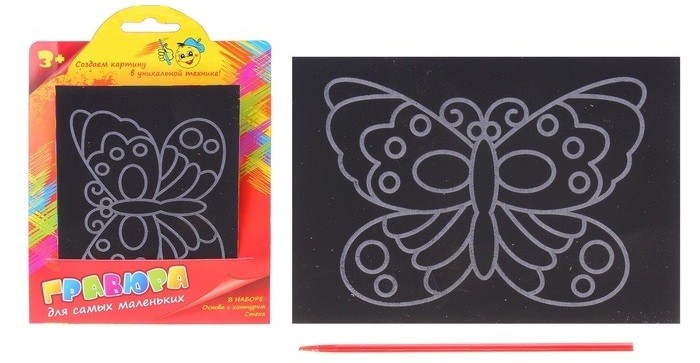Состав: основа с контуром, стека. Размер: 9,5 х 13 см. Маленькому художнику будет несложно нарисовать бабочку. При этом используется древний метод гравировки поверхности. В наборе для творчества уже имеется основа с нанесенным на нее контуром рисунка. При помощи специального штихеля ребенок снимает верхний слой, тем самым, получая изображение бабочки.