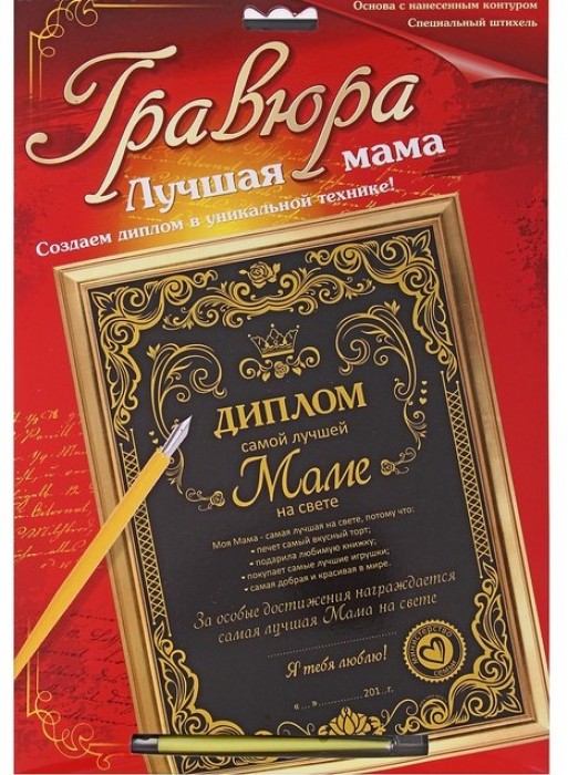 Гравюра "Лучшей маме" с металлическим эффектом - золото , в комплекте штихель – это многослойное панно, покрытое черной краской, на которое нанесен контур рисунка. С помощью особого скребка (штихеля), который входит в набор, путем процарапывания и создается гравюра.