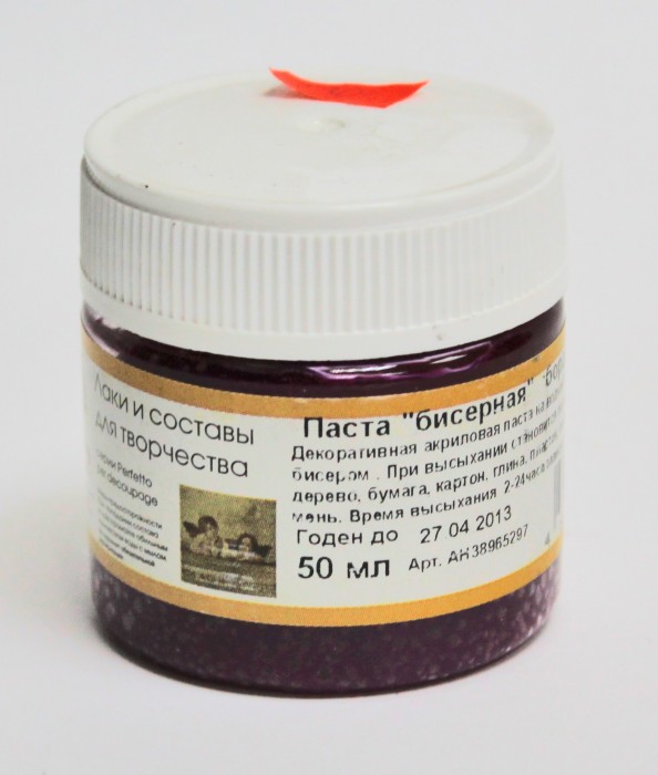Бисерные пасты – акриловые декоративные пасты на водной основе с мелким стеклянным бисером. Используется для декора любых твердых поверхностей. На прозрачных поверхностях достигается максимальный эффект. Паста легко наносится и формируется с помощью мастихина. Подходит для трафаретной техники. Пасты можно смешивать друг с другом. Применение пасты: нанести на сухую чистую поверхность, сформировать и оставить на 24 часа сохнуть. Бисерная паста после высыхания становится твердой.