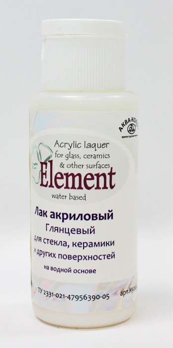 Лак глянцевый акриловый для стекла, керамики и других поверхностей. На водной основе. Лак не имеет запаха, нетоксичен, негорюч.